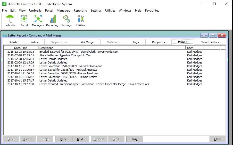 Once a Letter is created, that Letter can be re-used as often as required. A user can add who to send it to. Copies of the Letter can appear on the relevant Portal as well as the individual documnet tab of the Contractor, Agency or Company