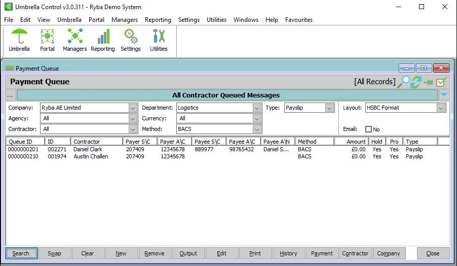 There is a history of every payment, searchable by PaymentRun ID, Contractor, Agency, Company and Department. With relevant access, users can re-create a BACS file from any historic record